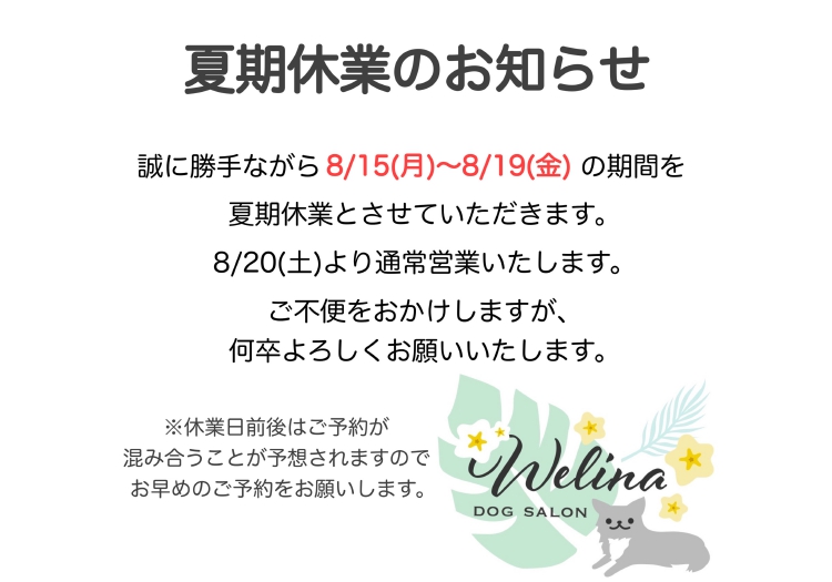 いつもDog Salon Welinaをご利用いただきありがとうございます。